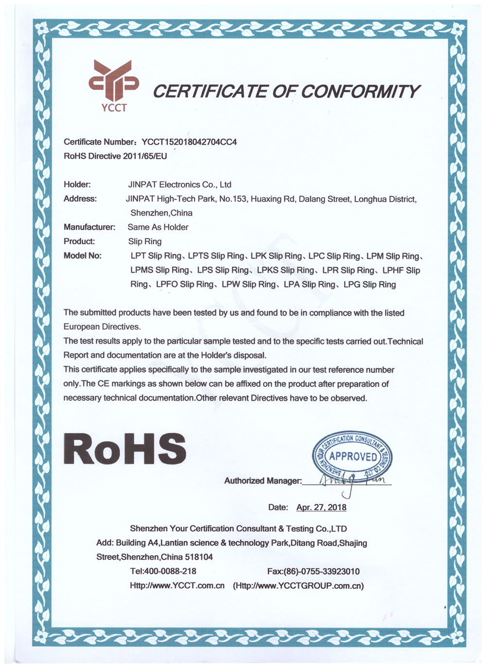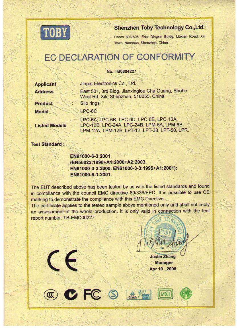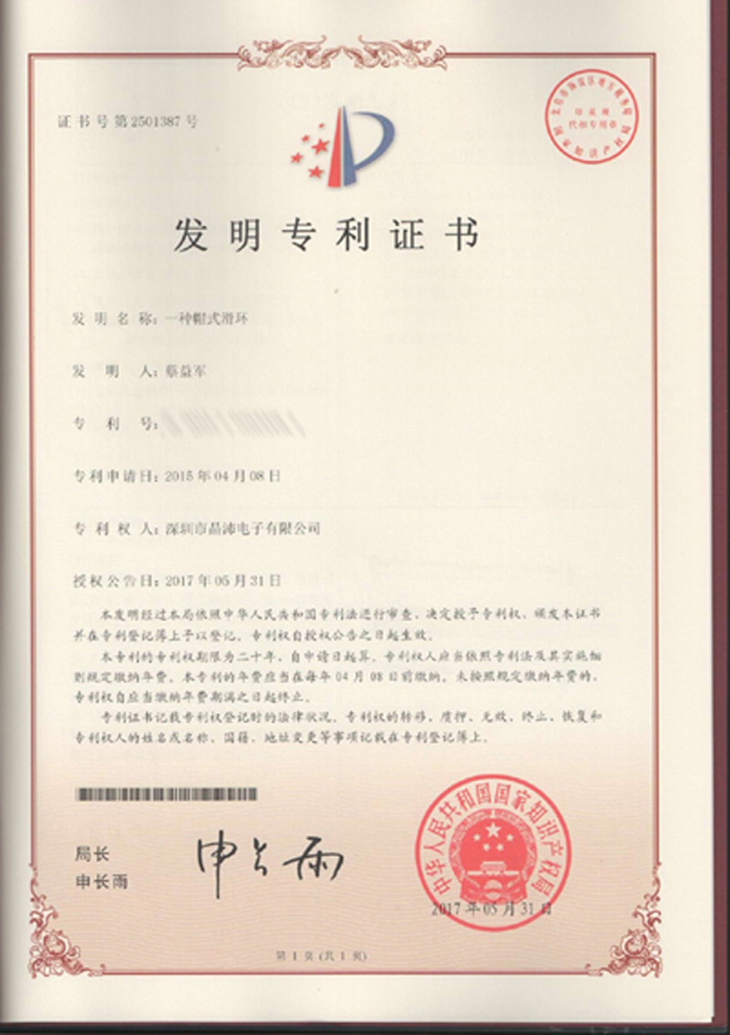 晶沛通過(guò)了歐盟CE認(rèn)證风声水起、FCC認(rèn)證雪上加霜、SGS認(rèn)證一石二鸟(一举两得)、BV“船級(jí)社”認(rèn)證、防爆認(rèn)證等多項(xiàng)認(rèn)證,生產(chǎn)的導(dǎo)電滑環(huán)都符合RoHS環(huán)保要求,先后被授予“國(guó)家高新技術(shù)企業(yè)”稱(chēng)號(hào),目前已獲得45項(xiàng)專(zhuān)利,其中發(fā)明專(zhuān)利6項(xiàng)。